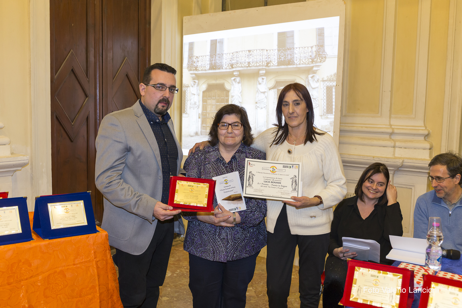 Lucia Bonanni di Scaperia/San Piero a Sieve (FI) vincitrice del 1° Premio assoluto per la sezione poesia in lingua italiana riceve il premio da parte di Lorenzo Spurio (Presidente del Premio) e di Susanna Polimanti (Presidente di Giuria).