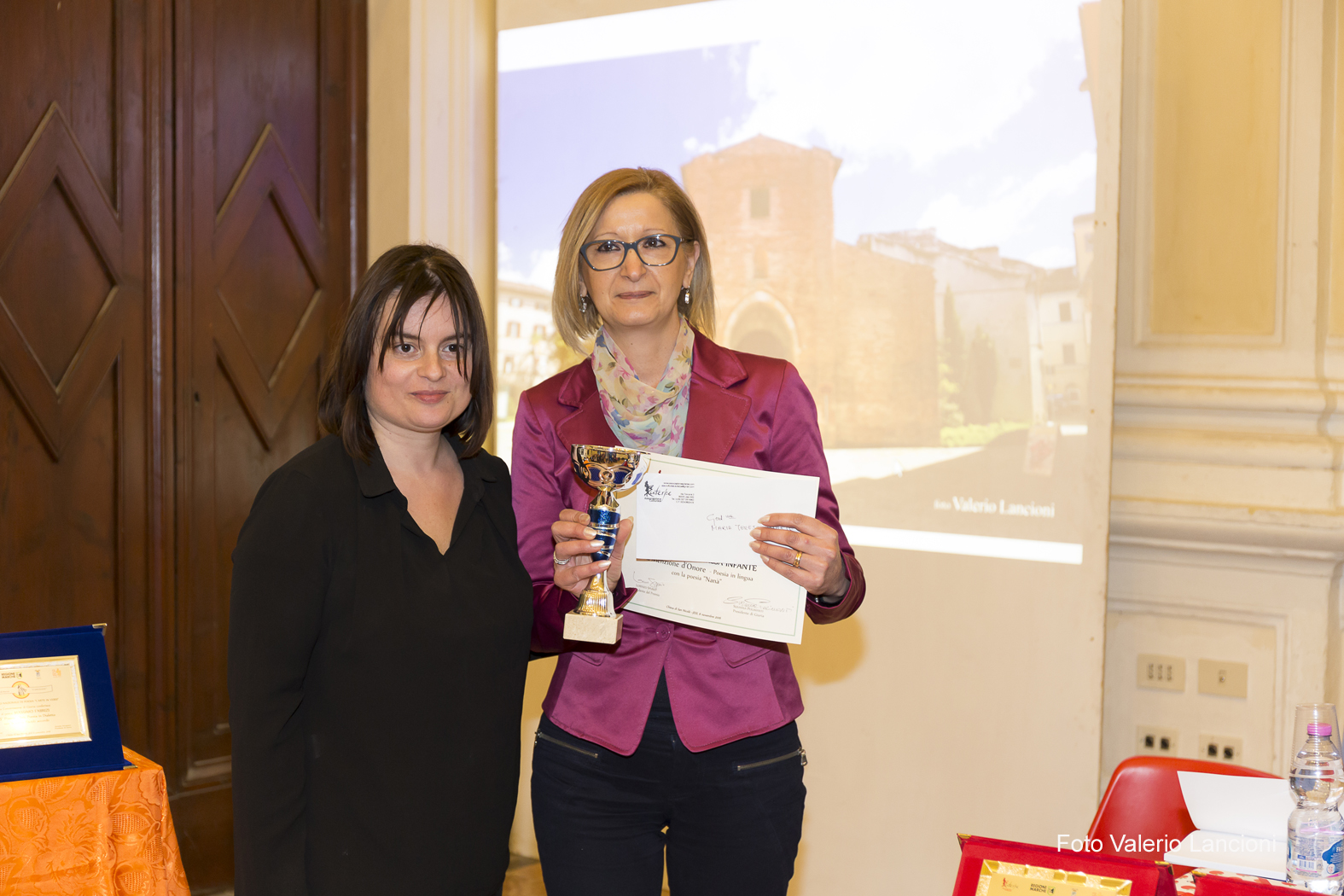 Franca Donà di Cigliano (VC) vincitrice della Menzione d'Onore per la sezione poesia in lingua italiana, riceve il premio dalla giurata Valentina Meloni.