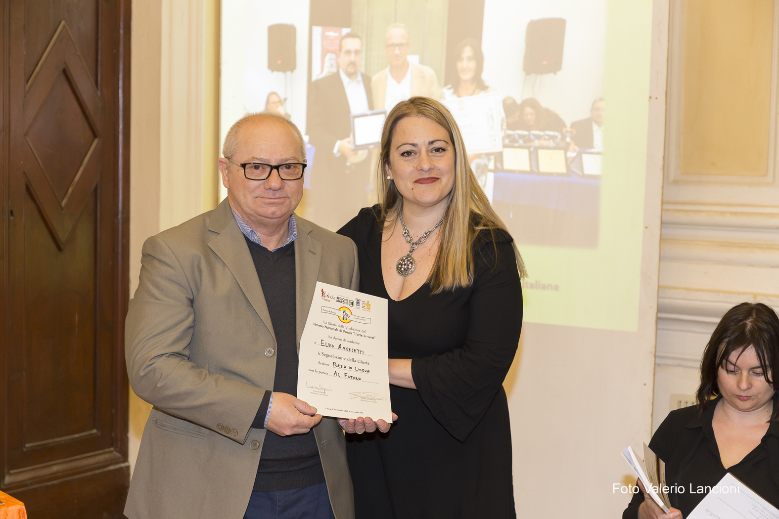 Elvio Angeletti di Senigallia (AN) vincitore della Segnalazione della Giuria - sezione poesia in lingua italiana riceve il diploma dalla giurata Alessandra Prospero.