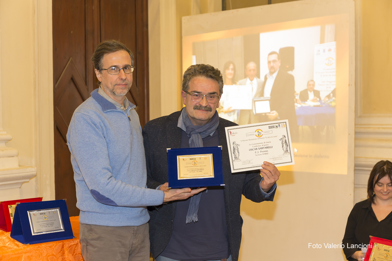 Massimo Fabrizi di Jesi (AN) vincitore del 3° Premio Assoluto per la sezione poesia in dialetto riceve il premio dai giurati Emanuele Marcuccio e Michela Zanarella.