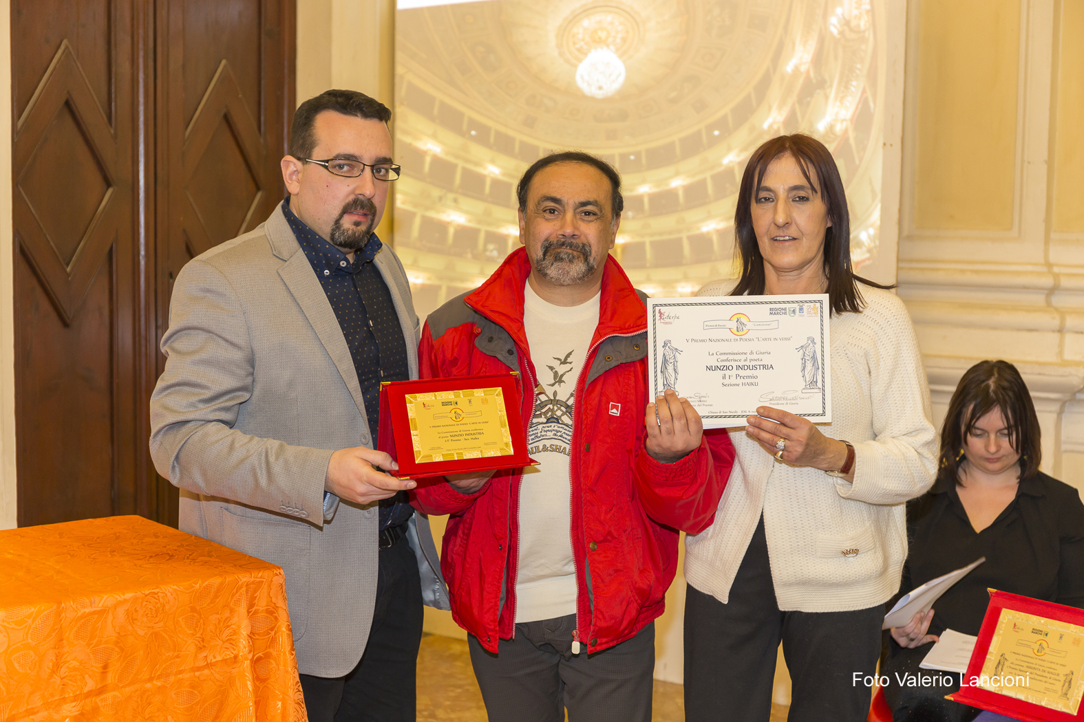 Nunzio Industria di Napoli vincitore del 1° Premio Assoluto per la sezione Haiku riceve il premio da Lorenzo Spurio (Presidente del Premio) e Susanna Polimanti (Presidente di Giuria).